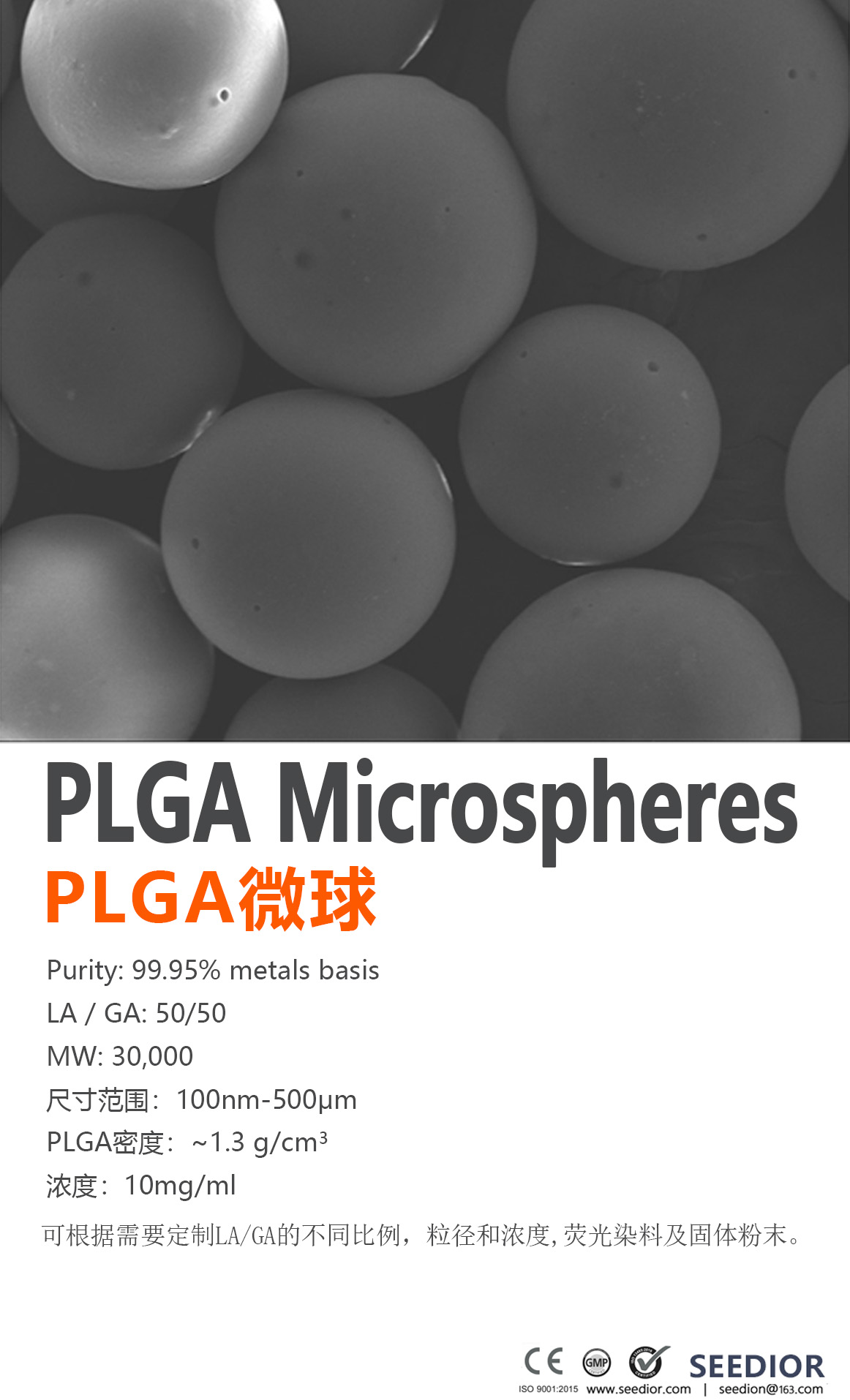 純度: 99.95%,重金屬≤10ppm,10mg/ml水分散液。采用乳化溶劑蒸發(fā)法制備,表面光滑、結(jié)構(gòu)致密,LA/GA比例:50/50,無定形結(jié)構(gòu),生物降解快、相容性好,易滲透,適用于短期藥物釋放場景,蛋白質(zhì)、肽、抗體和抗原的共價結(jié)合。LA比例提高,結(jié)晶度上升,親水性減弱,降解速率下降,適用于激素、抗生素或抗癌藥控釋,長效激素、慢性病藥物長效緩釋?!狙芯颗c應(yīng)用方向】:分子封裝吸附,長效控釋緩釋,靶向給藥,API,診斷成像,生化研究