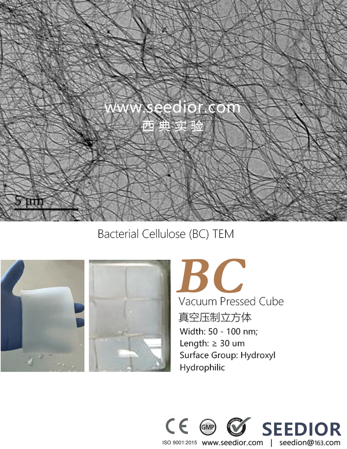 純度: 1.2%固含量,乳白色立方體。 纖維素直徑:50 – 100 nm,長度:≥ 30 um ;表面組:-OH(羥基); 結(jié)晶型:I型。西典細(xì)菌纖維素是以糖類為原料,由微生物發(fā)酵制備,由線性多糖聚合物相互連接形成純天然纖維。具有純度高(不含半纖維素、木質(zhì)素、蠟和果膠)、高結(jié)晶度、低粘度、生物相容性和降解性,兼具懸浮穩(wěn)定性,是一種理想的食品懸浮劑。此外,在生物醫(yī)藥領(lǐng)域、個(gè)人護(hù)理產(chǎn)品、工業(yè)應(yīng)用前景十分廣闊。