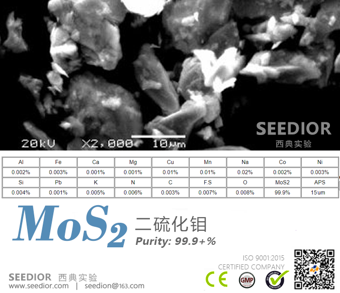 純度: 99.9+%; 黑色固體粉末,接觸有滑膩感,摩擦力好、活性表面積大、吸附能力大、反應性高、催化性能特別好。應用方向:固體潤滑劑,被譽為“高級固體潤滑油王”,特別適用于高溫高壓下。它還有抗磁性,可用作線性光電導體和顯示P型或N型導電性能的半導體,具有整流和換能的作用。二硫化鉬還可用作復雜烴類脫氫的催化劑。