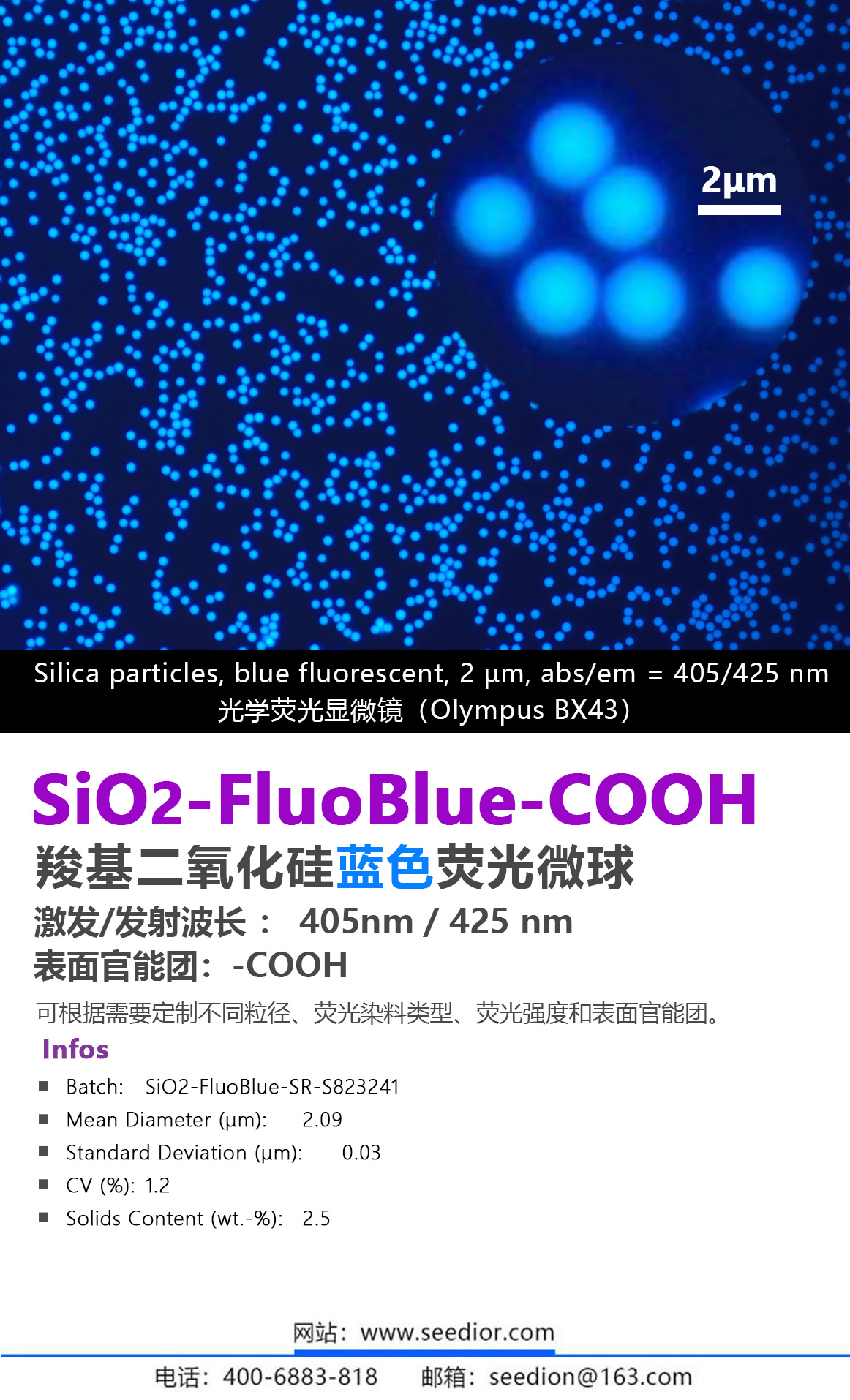 SiO2-fluoBlue-COOH羧基化熒光二氧化硅微球 | 二氧化硅熒光微球 | Ex/Em : 405nm/ 425nm