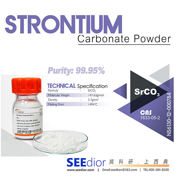 純度: 電子級(jí),0.3~0.5μm,99.5%;化學(xué)性質(zhì)?無色斜方晶系,或白色細(xì)微粉末。 難溶于水,微溶于氨水、碳酸銨,不溶于醇,易溶于氯化銨、硝酸銨中。應(yīng)用方向:?用于制造彩電陰極射線管、電磁鐵、鍶鐵氧體、煙火、熒光玻璃、信號(hào)彈等,也是生產(chǎn)其他鍶鹽的原料.