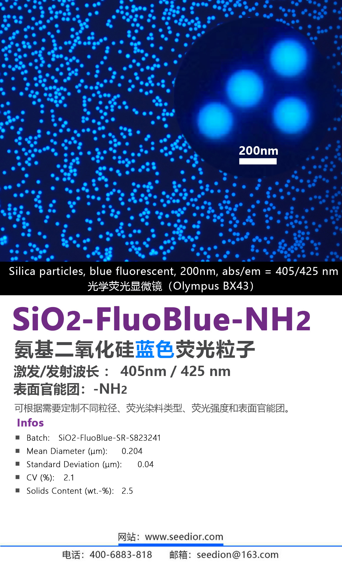 SiO2-fluoBlue-NH2單分散氨基熒光氧化硅微球 | 二氧化硅熒光微球 | Ex/Em : 405nm/ 425nm